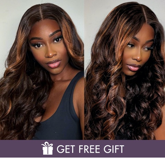 Breathable Cap Brown Highlight Loose Wave Glueless 5x5 Closure HD Lace Wig With Curtain Bangs